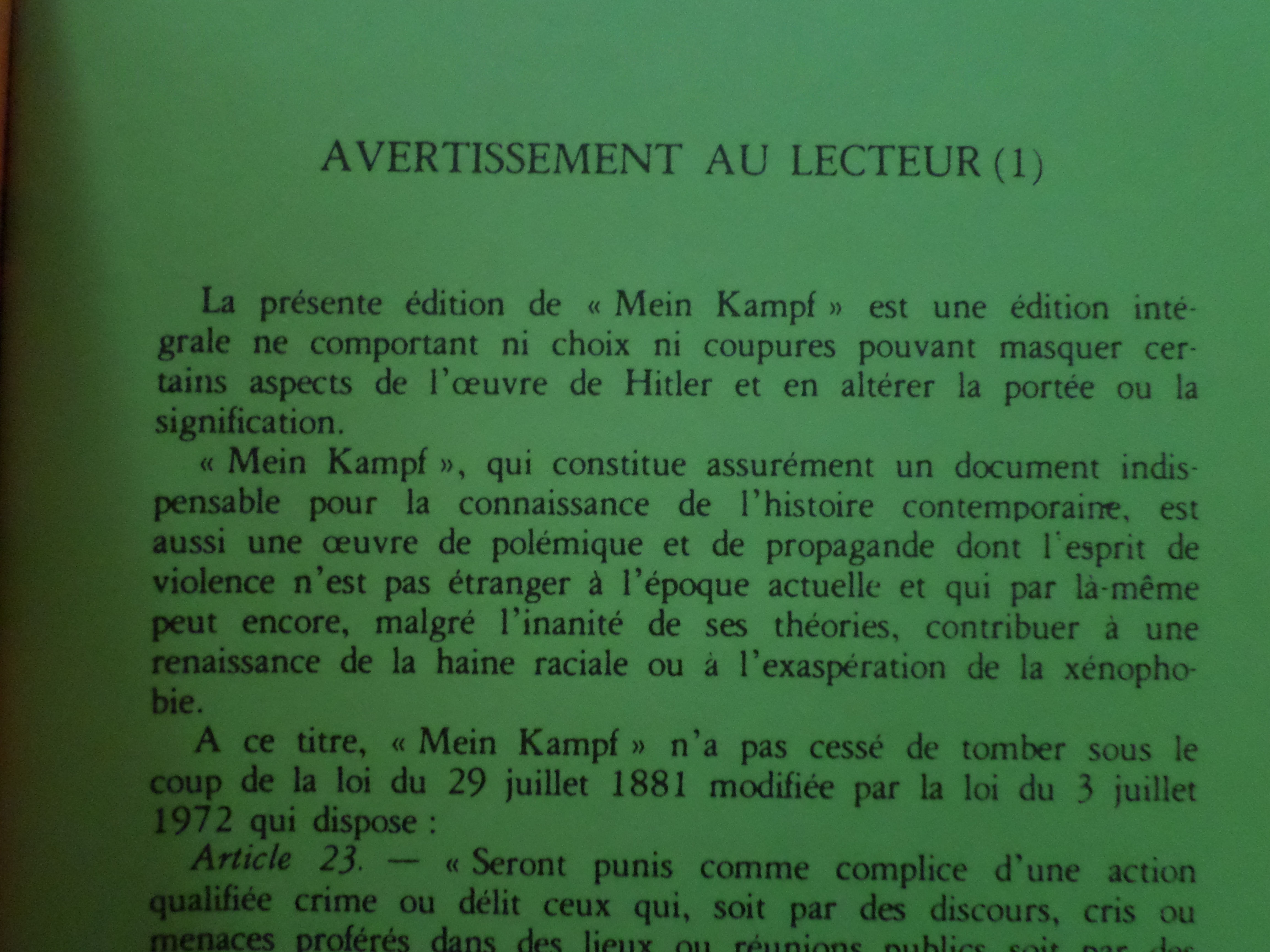 Until 2015, only one legal edition of Mein Kampf was published by Nouvelles Editions Latines. The opening words are “Warning to the Reader”, which features eight pages of judicial and historic references to the persecution of minorities under the Third Reich. Since the book was made open to the public, publishers are no longer obliged to keep this introduction.